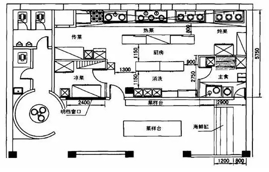 不能設計為獨立的工作間時,也要有相對獨立的功能區(qū)域??梢圆捎脽o形的隔斷,例如用冰柜、碗柜、水池排列形成墻,利用設備圍攏形成工作區(qū)間。結(jié)合實際情況靈活應用,可以,增加自然的采光亮度和通風效果,使工作間寬敞明亮。即使廚房處在沒有自然采光的位置,減少隔斷,或用透明度好的玻璃隔斷,也有利于照明和視距,節(jié)省照明用電便于通行、協(xié)調(diào)和管理。圖5-6是一個小餐館的廚房的設計圖紙,由于使用的設備比較多,采用了部分無墻隔斷設計。為保持衛(wèi)生潔凈,在主食加工間、涼菜間設計了隔斷,涼菜間設計了涼菜出餐口,便于出餐,也保證了清潔衛(wèi)生。涼菜間隔斷可阻擋油煙廢氣、清潔美觀,也隔斷了客人從涼菜出餐口向內(nèi)觀望的視線。消洗、傳菜間采用了無墻隔斷,使功能區(qū)域分割清楚,又便于配合工作。