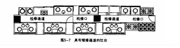 設備維修保養(yǎng)是必不可少的。有條件的廚房應盡量留出設備維修空間或機動的空間。如爐具的用量大、處在高溫潮濕的環(huán)境中,容易發(fā)生故障,作為主力設備,如發(fā)生故障.必須盡快維修。灶臺一般不宜搬動,可設維修通道安裝、檢修、維修、保持衛(wèi)生清潔。圖5-7是一個大飯店的熱菜間的灶臺一部分,在兩排灶臺之間設計了0.7m凈寬的檢修通道。