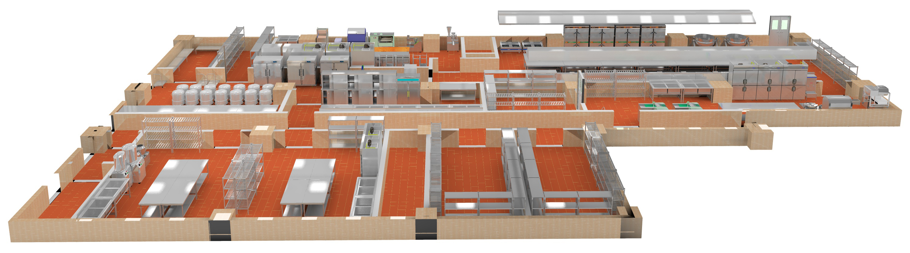 以主通道位置與走向?yàn)橹鞲擅},貫穿廚房,連通其他工作間,按照工藝順序確定其他工作間的位置,也就是各工作間按庫房、粗加工間,主副加工間、涼菜間、備餐間、洗碗間,餐廳的工藝流程順序布局,并與主通道連接順暢。在有條件的廚房中,應(yīng)該把各種工作間分開,特別是主食、副食、涼菜、洗碗、粗加工間要分開,把出餐與收殘出入門和路徑分開。只有把位置關(guān)系確定得合理通暢,保出餐和收殘的工作流程,減少無效勞動(dòng),才能提高工作效率。