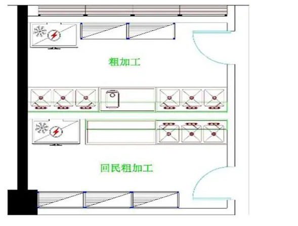 粗加工區(qū):為滿足衛(wèi)生要求,對原料分別進(jìn)行清洗和切割,不得與廚房其他區(qū)域交叉。