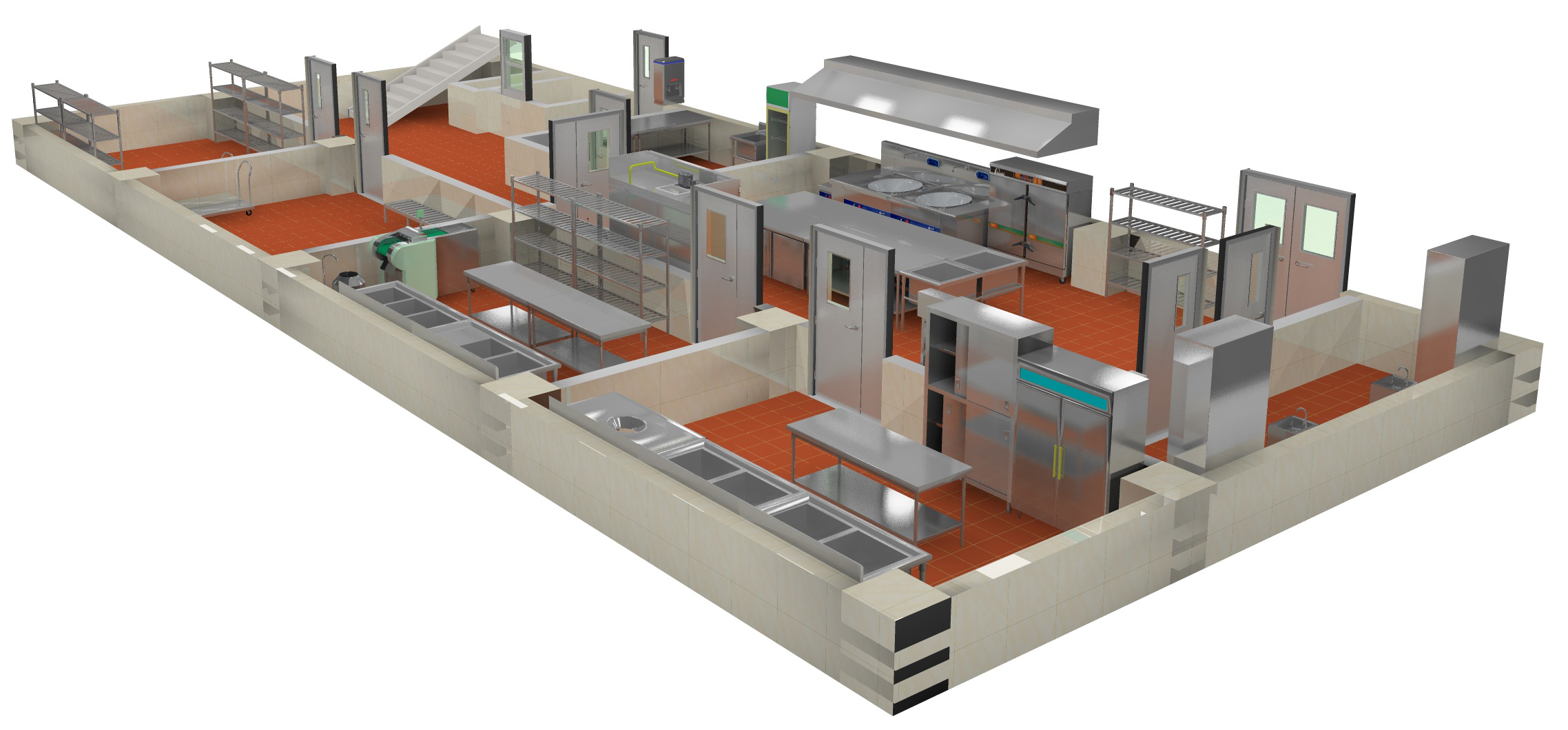 1)區(qū)域界限:廚房內(nèi)的非食品處理區(qū),廚房操作區(qū),清潔操作區(qū),餐廳區(qū)應(yīng)有明顯的區(qū)域界限,規(guī)范中也有時(shí)確的強(qiáng)制要求。一般廚房階段性工作應(yīng)分為存儲、粗加工,熟制加工、出餐,收殘、洗消幾個(gè)較大的階段,這些階段性工作不能倒置,也不能摻混。根據(jù)環(huán)境條件,在規(guī)劃設(shè)計(jì)時(shí)要有明顯的階段區(qū)分,要有相對獨(dú)立的空間環(huán)境和運(yùn)行路線。