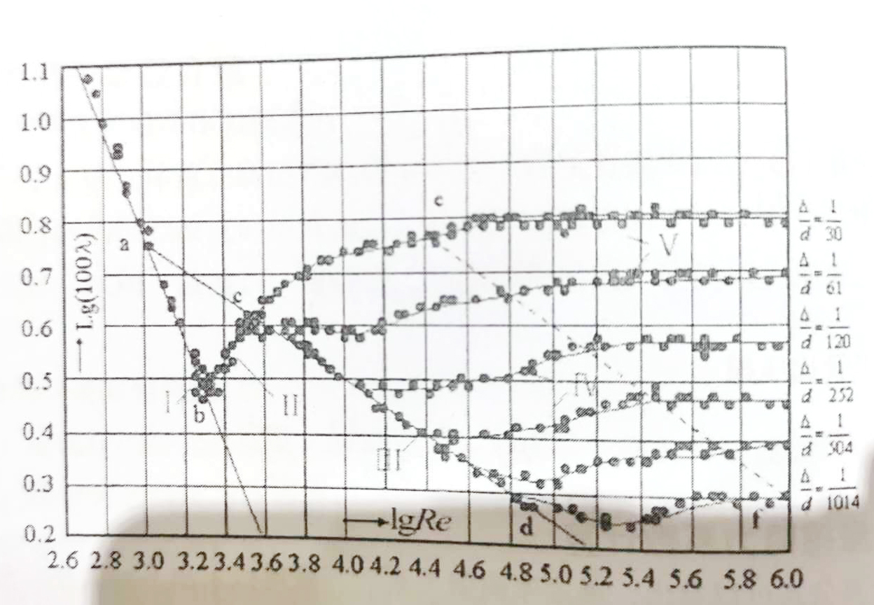 ?、髤^(qū):紊流光滑區(qū)。實(shí)驗(yàn)測(cè)試數(shù)據(jù)在坐標(biāo)圖的cd直線段上,不同粗糙度的曲線,Re>4000時(shí)進(jìn)入該區(qū)域,隨雷諾數(shù)的增大,相對(duì)粗糙度大的管道,實(shí)驗(yàn)點(diǎn)在雷諾數(shù)較低時(shí)便離開(kāi)此線;相對(duì)粗糙度小的管道,實(shí)驗(yàn)點(diǎn)在雷諾數(shù)較大時(shí)才離開(kāi)。