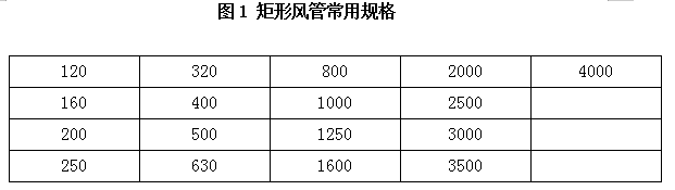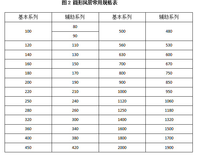 在安裝條件允許的情況下,在實(shí)際設(shè)計(jì)制作管道時(shí),還需要根據(jù)需要選擇合理的結(jié)構(gòu)尺寸。根據(jù)《通風(fēng)管道技術(shù)規(guī)程》(JCJ141-2004)的規(guī)定,矩形風(fēng)管的邊長與圓管直徑應(yīng)盡量選用常用規(guī)格,見表1和表2。矩形風(fēng)管長邊與短邊之比不宜大于4:1。金屬矩形風(fēng)管宜以外邊長(或外徑)為標(biāo)注尺寸;非金屬矩形風(fēng)管宜以內(nèi)邊長(或內(nèi)徑)為標(biāo)注尺寸。圓形風(fēng)管應(yīng)優(yōu)先選用表2中的基本系列。以下各表選自《通風(fēng)與空調(diào)工程施工質(zhì)量驗(yàn)收規(guī)范》(GB50243-2002)