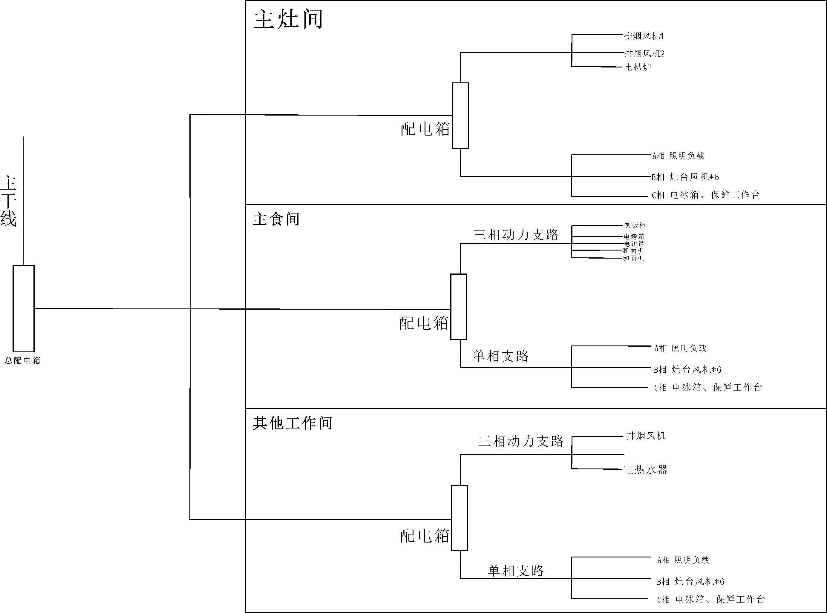 廚房供電系統(tǒng)用電負(fù)荷分為單相負(fù)荷與三相負(fù)荷、單相負(fù)荷主要為照明電,單相插座以及其他額定電壓為220V的電器用電。用電負(fù)荷的額定電壓均為單相220V,均勻分布到A、B、C三相。這類(lèi)負(fù)荷也叫作相負(fù)荷。一般分為兩個(gè)獨(dú)立的系統(tǒng):照明系統(tǒng)和220V單相負(fù)荷動(dòng)力系統(tǒng)。單相負(fù)荷動(dòng)力系統(tǒng)通過(guò)單相插座向電冰柜、絞肉機(jī)、保鮮作臺(tái)、灶臺(tái)風(fēng)機(jī)供220V動(dòng)力電。380V三相負(fù)荷,分別供電到各個(gè)工作間額定電壓為380V的動(dòng)力支路,主要供蒸飯柜、傳菜電梯、電熱開(kāi)水器、排燈風(fēng)機(jī)等廚房設(shè)備用電,線(xiàn)路不宜和其他獨(dú)立控制的設(shè)備接在同一個(gè)分支回路。具體情況見(jiàn)下圖: