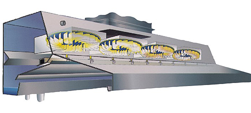 在風(fēng)機葉片上設(shè)置特殊水霧化結(jié)構(gòu),在引風(fēng)的同時,霧化洗滌液體,凈化流經(jīng)風(fēng)機的油煙。由于霧化密度、粒度與轉(zhuǎn)速相關(guān),當(dāng)風(fēng)機轉(zhuǎn)速較低時霧化效果下降,轉(zhuǎn)速高時,霧化效果和凈化效果要好一些。水循環(huán)需要水泵配合。對風(fēng)機増加水循環(huán)結(jié)構(gòu),必須采用耐腐蝕材質(zhì),在風(fēng)機前的管道內(nèi)仍然有積油,消防的效果要差一點。在北方冬季室外運行存在設(shè)備防凍問題。