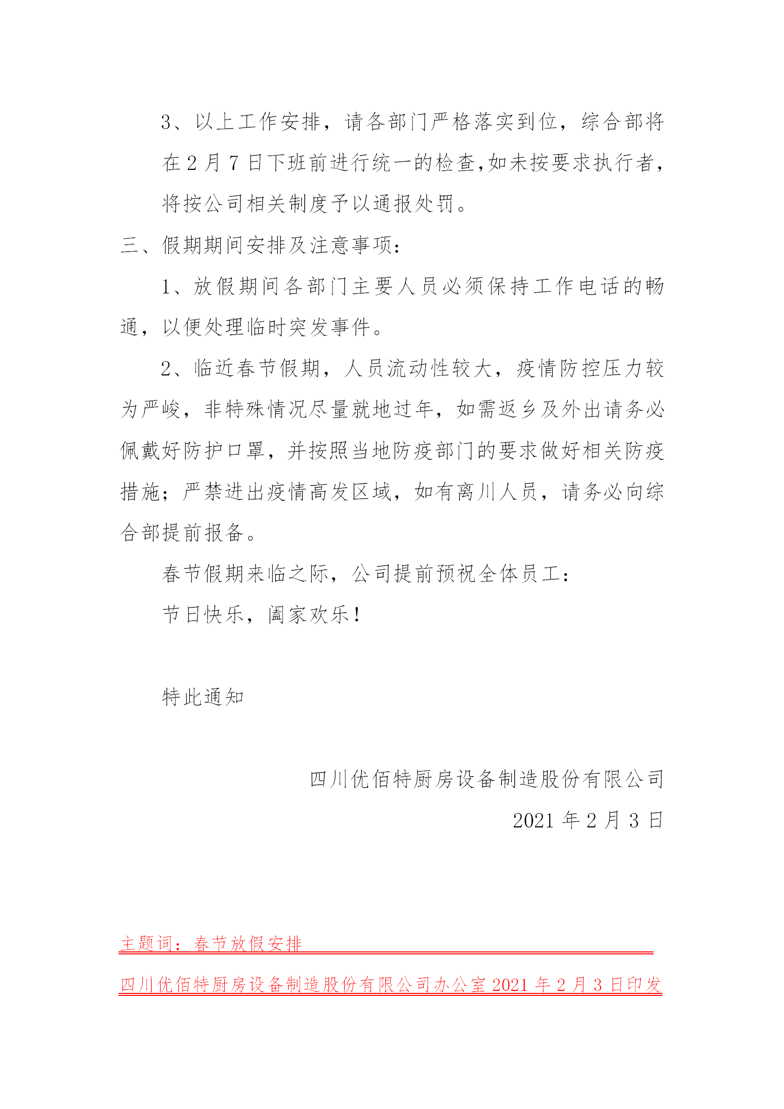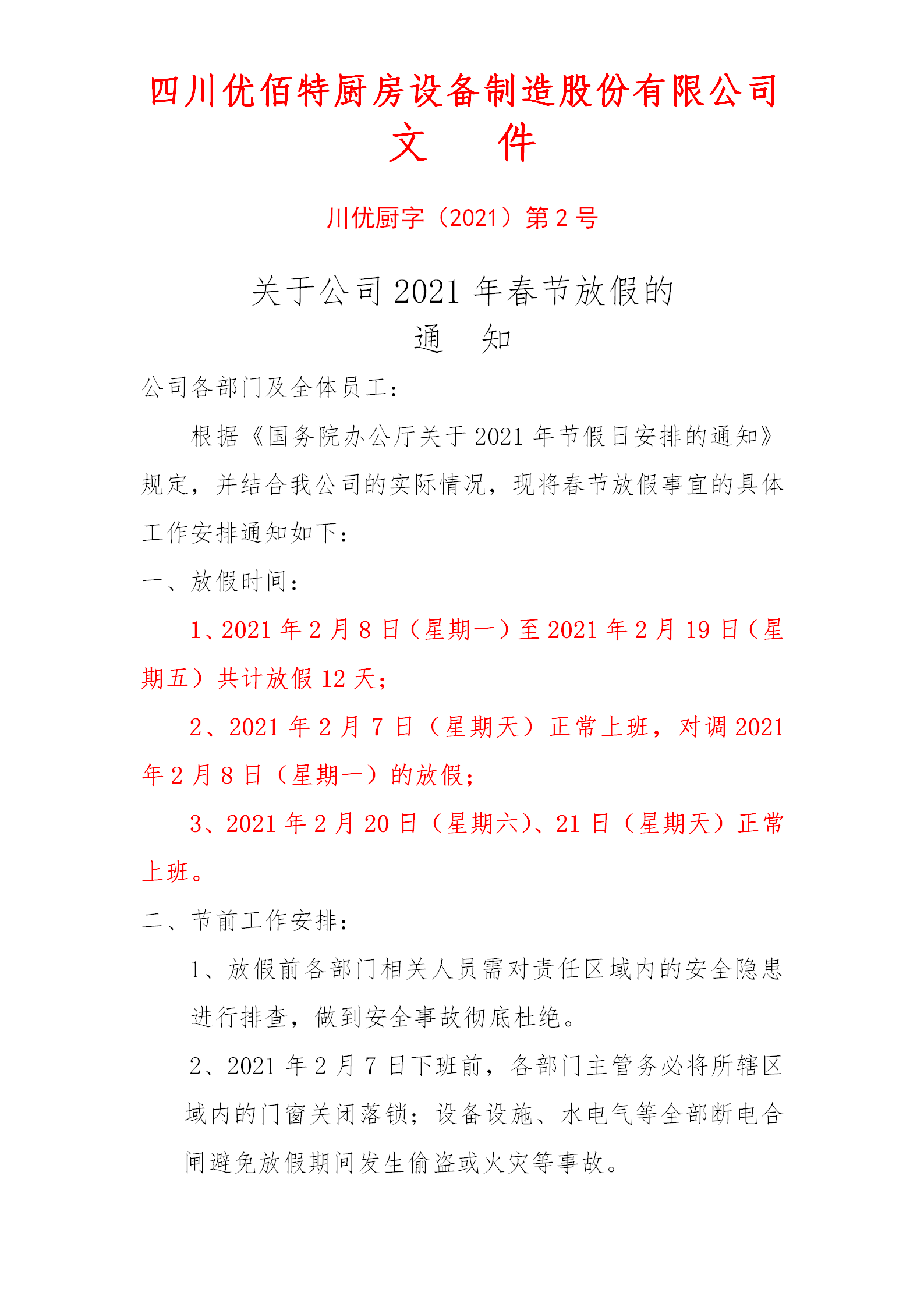 感謝你這一年來對四川優(yōu)佰特廚房設備制造股份有限公司的支持,春節(jié)假期將至,優(yōu)佰特公司祝你和你的家人新春快樂,財源廣進,萬事如意。我公司根據(jù)《國務院辦公廳關于2021年節(jié)假日安排通知》,并結合我公司實際情況,對春節(jié)放假做出如下安排: