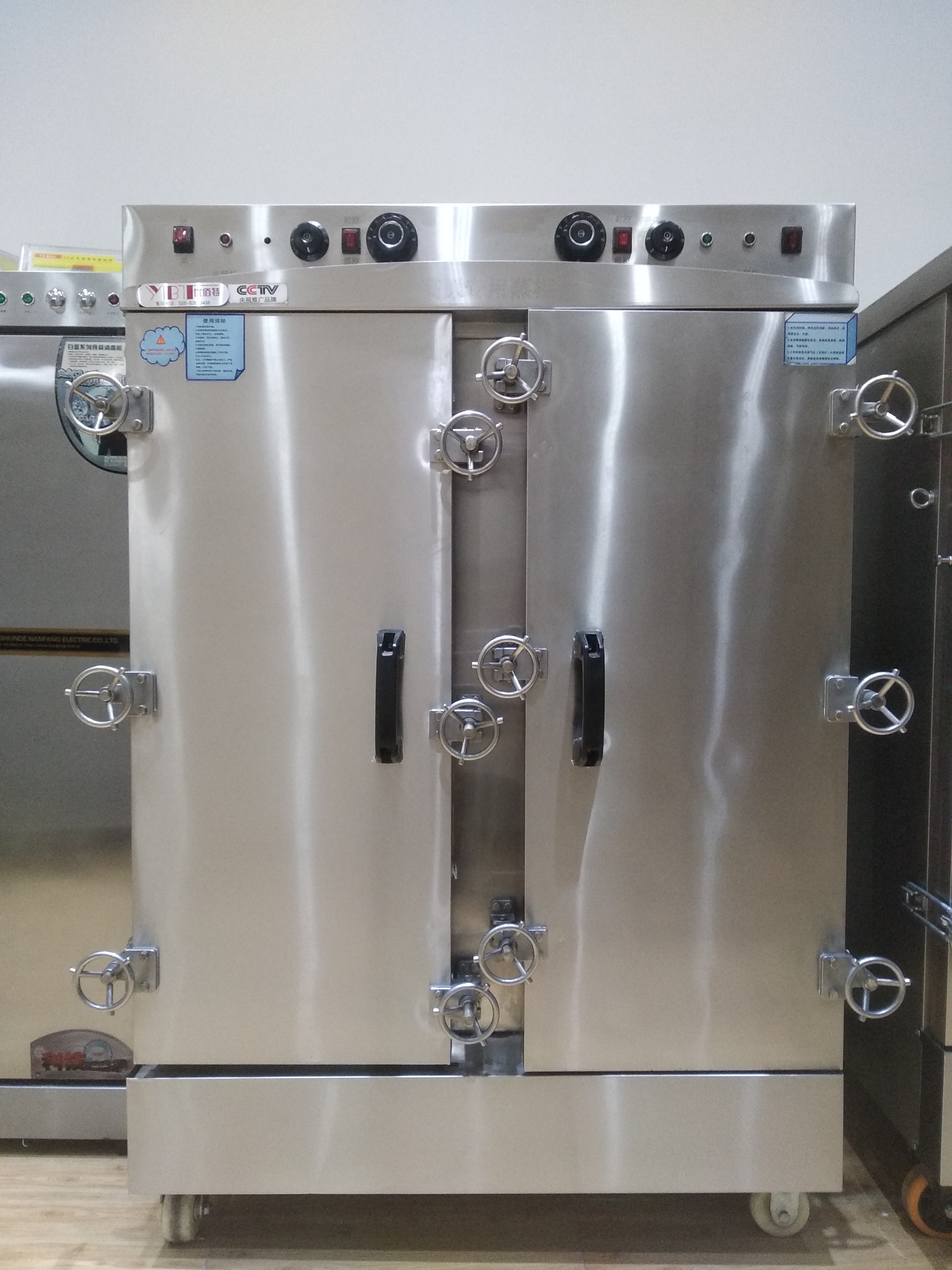 1. 蒸飯柜利用電、燃氣發(fā)熱,是大型廚房的烘烤設備。內部采用不銹鋼方盤作為容器,在蒸汽柜的下方,為了方便移動,安裝有萬向輪,外形像車,所以又叫做蒸飯車。