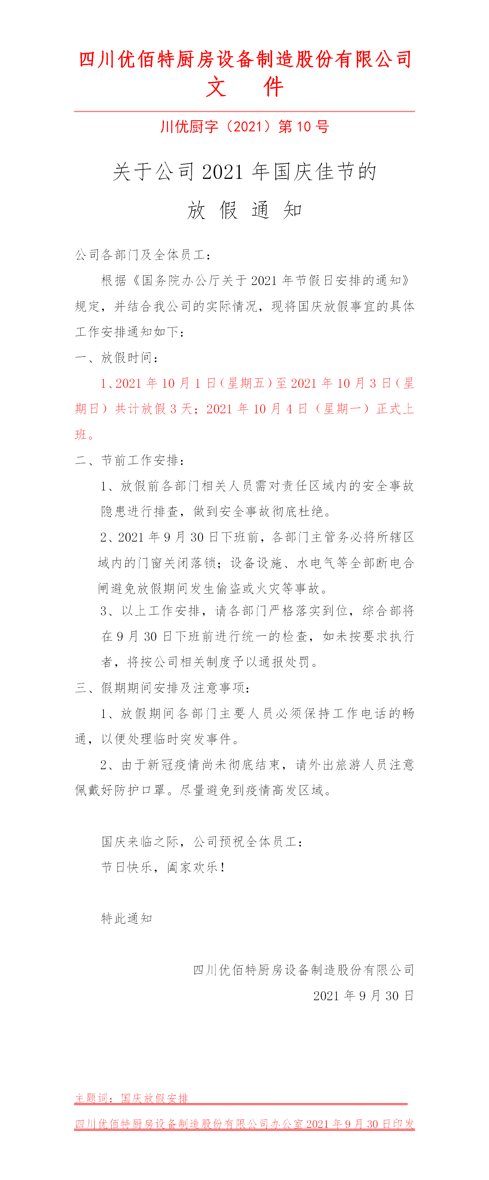 根據(jù)國務(wù)院2021年節(jié)假日放假安排,并結(jié)合我公司實(shí)際情況,現(xiàn)對(duì)國慶放假做出如下安排: