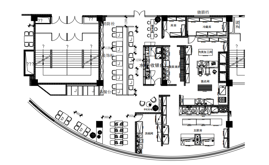 使用的灶具少,灶具主要是用大鍋灶煮面、熬粥,只需一兩眼炒灶用來制作主食配料,或用來煮零點(diǎn)的面條、餃子;使用的機(jī)械設(shè)備多,如和面機(jī)、壓面機(jī)、包子機(jī)、菜焰機(jī)、攪拌機(jī)等;蒸、煮、烤、炸、煎設(shè)備用得多,蒸飯柜、夾層鍋、烤箱、電炸 鍋、電餅鐺等;主食加工間與副食加工間特點(diǎn)不同,主食的米飯、饅頭、包子、餃子等食品大多是批量制作,批量蒸煮生產(chǎn)。所以,除煎炸食品外,生制與熟制可以分開區(qū)域設(shè)置。熟制區(qū)需要出餐臺(tái),生制區(qū)需要機(jī)械設(shè)備、工作臺(tái)、及原料運(yùn)送,傳餐通道要有一定的寬度,通道要設(shè)置合理。由于經(jīng)營(yíng)方式、餐品類別、加工工藝、出餐產(chǎn)量大小差異較大,主食加工間布局與飯店廚房設(shè)計(jì)自有特點(diǎn)。