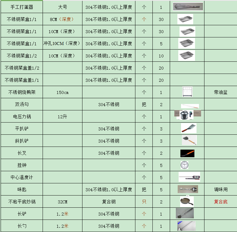 4、明確廚房設(shè)備規(guī)格型號(hào)。