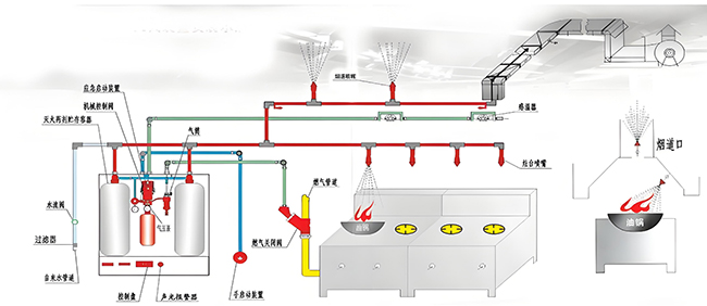 3、廚房專用滅火裝置:廚房專用滅火裝置是由滅火劑儲瓶與關(guān)斷燃料閥機(jī)構(gòu)、機(jī)械驅(qū)動裝置、霧化與噴頭管網(wǎng)、感溫易熔金屬探測器與控制管路、手動應(yīng)急啟動等組成。廚房安裝該系統(tǒng)之后,可24小時(shí)不間斷的對廚房的灶臺、集油煙罩、排煙管道進(jìn)行全方位的消防保護(hù)。