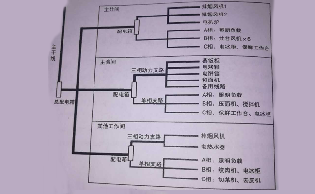 一般酒店的廚房供電系統(tǒng)用電負荷分為單相負荷和三相負荷。單相負荷主要為照明電源、單相插座以及其他額定電壓為220V的電器供電。其特點為用電負荷的額定電壓均為單相220V.若均勻分布到A、B、C三相,這類負荷也叫做相負荷。一般分為兩個獨立的系統(tǒng):照明系統(tǒng)和22V單相負荷動力系統(tǒng)。380V三相負荷分別供電到各個工作間。額定電壓為380V的動力支路主要供蒸飯柜、傳菜電梯、電熱開水器、排煙風(fēng)