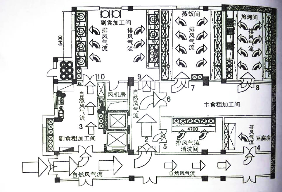 首先,圖一是一個學(xué)校食堂的半地下廚房,售飯區(qū)和明檔在二、三層,傳菜收殘全部用傳菜梯,廚房有一個出入口1號門。由于不補(bǔ)充新風(fēng),負(fù)壓太大,主食加工的蒸飯間和前烤間出入口7號、8號門關(guān)門后就很難打開,此時,下水道的污氣、污水回流。