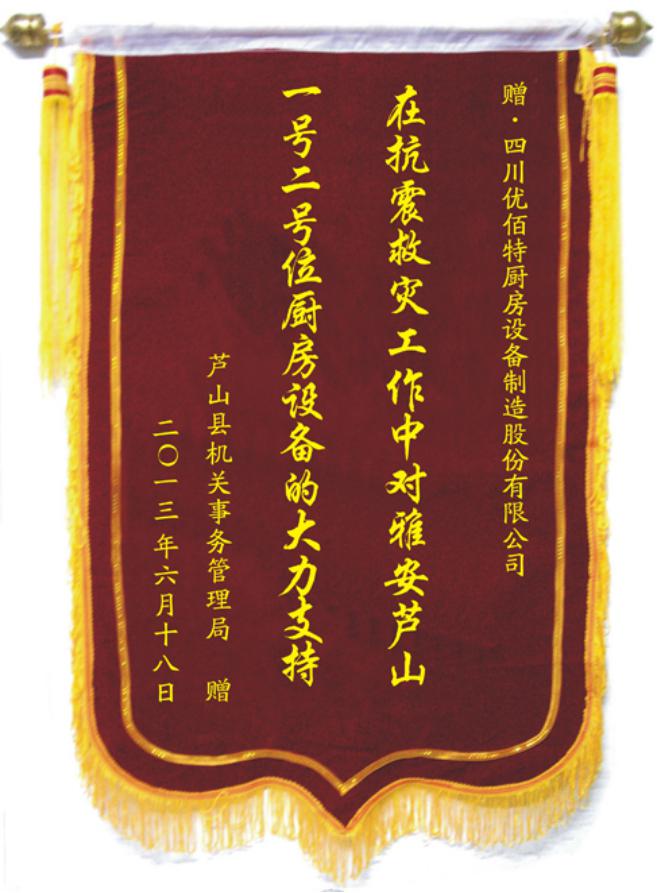 我公司2013年雅安蘆山地震中援建廚房設(shè)備,獲蘆山縣贈(zèng)錦旗